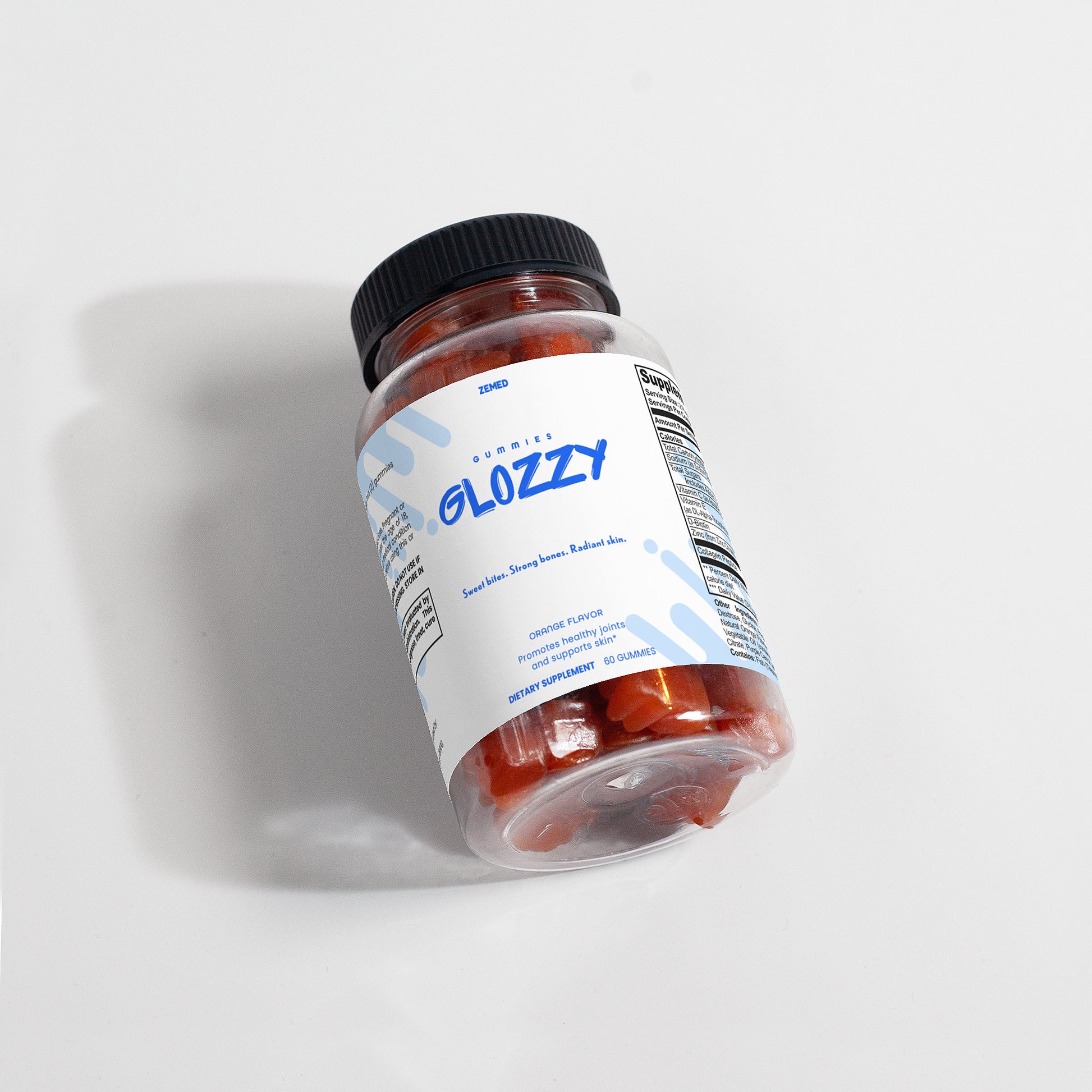 Ingredients: Sodium (as Sodium Citrate), Vitamin C (as Ascorbic Acid), Vitamin E (as DL-Alpha-Tocopheryl Acetate), D-Biotin, Zinc (from Zinc Citrate), Collagen Peptide, Sugar, Glucose Syrup, Dextrose, Glycine, Pectin, Coconut Oil, Citric Acid, Natural Orange Flavor, Sucrose fatty acid ester, Vegetable Oil (contains Carnauba Wax), Sodium Citrate, Purple Carrot Juice Concentrate (Color).